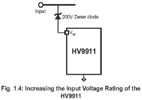 IC內(nèi)部提供穩(wěn)壓電路9∼250V輸入電壓,可輸出7.75V電壓輸出提供IC內(nèi)部電源使用,若輸入電壓范圍提升可經(jīng)由外接一個200V,2WZenerDiode于輸入電壓與IC的Vinpin之間(如圖1-4),這可使得輸入電壓范圍可提升至450VDC,亦可以使得IC內(nèi)部穩(wěn)壓電路所產(chǎn)生的功率損耗分散一部份在ZenerDiode上。