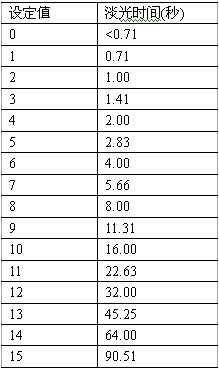 淡光時(shí)間是指由燈功率的某一值變化到燈功率的又一新值時(shí)所需的時(shí)間,利用淡光時(shí)間滑動(dòng)控制條(見主界面圖2)可選擇16個(gè)不同的淡光時(shí)間值(如表2所示)。