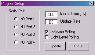 端口選擇、指示器和燈發(fā)光電平的輪詢、事件定時(shí)器、更新率選擇等。如圖3表示程序設(shè)置工作界面所示。