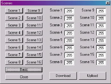 按下“scenexx”按鈕可工作在預(yù)先定義的背景級(jí),背景級(jí)的選擇支持所有工作模式,利用主界面的“廣播”尋址并按下“scene3”按鈕將使所有電子鎮(zhèn)流器預(yù)先定義的“scene3”背景級(jí)(如果預(yù)先有定義)。