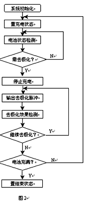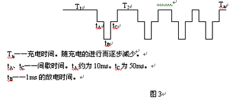 整個(gè)系統(tǒng)的控制過程為:蓄電池組開始充電一段時(shí)間后,檢測電池電壓,當(dāng)達(dá)到電池出氣點(diǎn)電壓(約2.4V/單體)時(shí),停止充電,然后進(jìn)行大電流(約2C)放電去極化,時(shí)間為1ms,充放電曲線如圖3所示。放電后,再檢測電池狀態(tài),進(jìn)行去極化效果檢測,達(dá)到去極化效果則回轉(zhuǎn)充電,否則,再次進(jìn)行去極化放電,直至達(dá)到去極化要求的效果才回轉(zhuǎn)充電。如果連續(xù)放電n次(n=3),電池電壓變化很小,則充電完成并結(jié)束充電狀態(tài)。