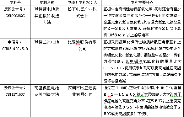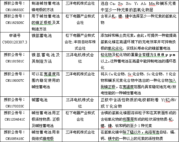 在電池配料時,通過機(jī)械混合法添加周期表中ⅡA、ⅢB、ⅣB、ⅦB、ⅧB、ⅡB主族元素和3、4、5周期的元素、氧化物或氫氧化物,能較好地提高或改善鎳氫高溫性能。世界著名電池制造公司在華申請授權(quán)的專利中多有介紹,如日本松下、三洋;中國比亞迪;德國H.C.施塔克等公司。詳細(xì)見下表: