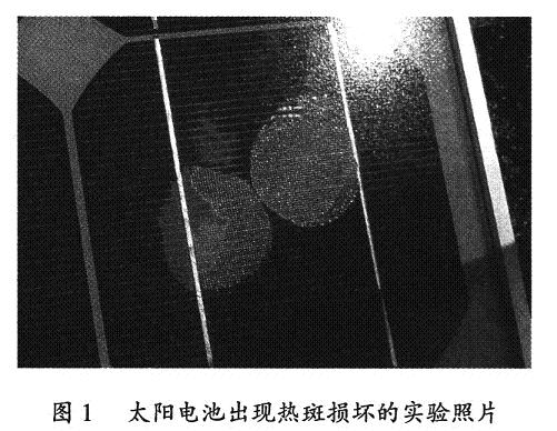太陽電池熱斑是指太陽電池組件在陽光照射下,由于部分組件受到遮擋無法工作,使得被遮蓋的部分升溫遠遠大于未被遮蓋部分,致使溫度過高出現(xiàn)燒壞的暗斑,如圖1所示。熱斑可能導致整個電池組件損壞,造成損失。因此,需要研究造成熱斑的內(nèi)在原因,從而減小熱斑形成的可能性。太陽電池熱斑的形成主要由兩個內(nèi)在因素構成,分別與內(nèi)阻和太陽電池自身暗電流大小有關。