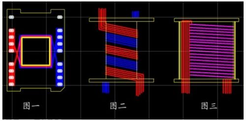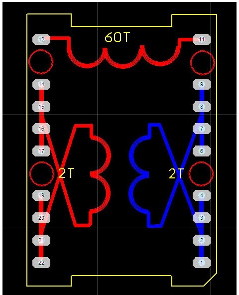 先用5根0.93線繞2圈(見圖二中紅線),中間留空隙,再在空隙處用另外5根線繞2圈(見圖二中藍線),每根線長約37CM。用同樣的方法繞二層,層間包二層膠帶,這樣就相當(dāng)于用了10根線并繞。繞完低壓繞組,在繞組外用高溫膠帶包三層。繞低壓繞組要注意的問題是:線頭留在下面,即骨架引腳處,線尾留長一點,暫時留在骨架的上面(等繞完高壓繞組后要向下折下來)。從(圖一)可以看出,實際上,低壓繞組的頭和尾是有一段是重疊的,也就是不是2圈,而是約2.2圈,這樣做可以大大減少漏感。