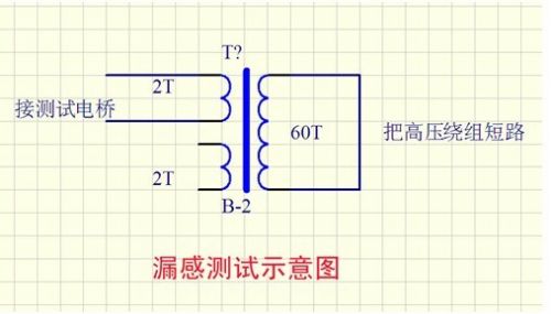我發(fā)現(xiàn)用這種方法繞制的變壓器漏感比較小。以前用銅帶繞制,漏感一般在0.8uH以上,現(xiàn)在可以做到0.4uH以下。我想原因是:因為銅帶要焊引出線頭,這樣就留下了一個錫堆,再繞高壓繞組時,中間就有一個空隙,導(dǎo)致耦合不緊。下圖為測試漏感示意圖。