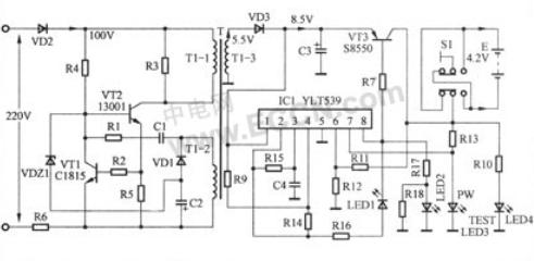 該電路主要由一塊軟塑封集成塊IC1(YLT539)和三極管VT3等組成。從變壓器T的1-3繞組感應(yīng)出的交流電壓5.5V經(jīng)二極管VD3整流、電容C3濾波后,輸出一個(gè)直流8.5V左右電壓(空載時(shí)),該電壓一部分加到三極管VT3的e極;另一部分送到軟塑封集成塊IC1(YLT539)的1腳,為其提供工作電源。集成塊IC1有了工作電源后開(kāi)始啟動(dòng)工作,在其8腳輸出低電平充電脈沖,使三極管VT3導(dǎo)通,直流8.5V電壓開(kāi)始向電池E充電。