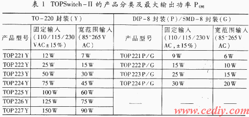根據(jù)封裝形式,TOPSwitch-II可劃分成三種類型:TOP221Y~227Y(TO-220封裝),TOP221P~224P(DIP-8封裝),TOP221G~224G(SMD-8封裝),產(chǎn)品分類詳見表1。