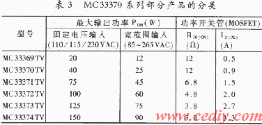 MC33370系列包括MC33369~MC33374五種規(guī)格、17種型號(hào)。以TO-220五腳直彎式封裝為例,其產(chǎn)品分類見表3。