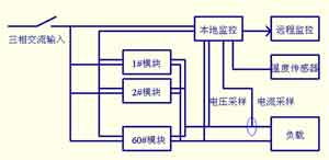 大功率電動汽車充電機的輸入為額定線電壓380V、50Hz的三相交流電,輸出額定電壓700V,額定電流600A。系統(tǒng)采用19"標(biāo)準(zhǔn)機架,結(jié)構(gòu)緊湊、布局合理、外型美觀大方。外型尺寸:高×寬×深為2200mm×600mm×600mm。采用60個模塊并聯(lián),每個模塊10A/700V,模塊尺寸:高×寬×深為133mm×425mm×270mm,15層4列,分四個柜體安放,四個柜體可分開運輸,使用時緊湊左右排列。機架前門、后門均為雙開門,方便檢修。電源進(jìn)線和匯流排輸出位置均在底部輸入。電源輸入斷路器及監(jiān)控單元觸摸屏安裝在主機中間控制柜前部。充電機控制結(jié)構(gòu)示意圖如圖2所示。