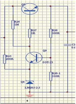 因為S-8251芯片輸入電壓范圍是2.5~16V,總線輸入電壓范圍24V,必須先經過降壓環(huán)節(jié),這將使變換效率大打折扣。降壓電路靜態(tài)功耗要小于幾十μA量級,否則總線電流很難做到小于3.5mA。我采用MOSFET串聯降壓方式,基準源沒有采用穩(wěn)壓二極管,而是使用LM385,做到靜態(tài)電流36μA。圖3為24V降壓到16V電路。