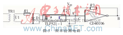 單片機(jī)對常用和備用電源進(jìn)行頻率檢測,根據(jù)檢測的結(jié)果來判斷電源是否發(fā)生故障,然后進(jìn)行相應(yīng)的控制操作。頻率檢測電路主要以光耦TLP521-1和施密特觸發(fā)器CD40106為主要器件構(gòu)成。頻率檢測的硬件電路如圖3所示。電網(wǎng)中的交流電經(jīng)變壓器后變換為電壓較低的交流信號U1,U1經(jīng)過光耦TLP521-1后就變成了同頻率的方波信號。為了防止光耦內(nèi)部的二極管被反向電流擊穿,在光耦外部反向接了1個(gè)二極管。為了使光耦輸出的方波信號更加規(guī)整,為單片機(jī)測量頻率做好準(zhǔn)備,在光耦的輸出級加了施密特觸發(fā)器CD40106。利用PIC16F884單片機(jī)的輸入捕捉(CCP)功能記錄第一個(gè)上升沿的時(shí)間t1和下一個(gè)上升沿的時(shí)間t2,則信號的周期T=(t2-t1)μs。為了提高測量的精度,采用多次測量取平均值的方法來實(shí)現(xiàn)。