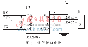 為了使控制器能夠方便地與上層控制平臺進(jìn)行聯(lián)網(wǎng)通信,實(shí)現(xiàn)控制器的遠(yuǎn)程控制、遠(yuǎn)程監(jiān)控等功能,本設(shè)計(jì)為控制器添加了通信接口,采用簡單經(jīng)濟(jì)、廣泛應(yīng)用于工業(yè)上的RS485總線與外界進(jìn)行通信。RS485采用差分信號進(jìn)行傳輸,有較好的抗干擾能力,通過轉(zhuǎn)換模塊很容易實(shí)現(xiàn)從RS485到RS232的信號轉(zhuǎn)換,從而便于和上位計(jì)算機(jī)通信。選用了Maxim公司的MAX485芯片作為通信控制的主要器件,其工作電源為+5V,采用半雙工通信方式,能夠?qū)TL電平轉(zhuǎn)換為RS485電平,內(nèi)部包含了1個(gè)驅(qū)動(dòng)器和1個(gè)收發(fā)器,通過串口可以方便地與PIC16F884進(jìn)行通信。MAX485的接口電路如圖5所示。