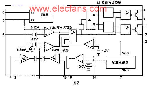 死區(qū)時間由4腳電壓來設(shè)定,范圍為0~3.3V之間。誤差放大器A1作為輸出電壓取樣誤差放大,結(jié)果通過PWM比較器控制脈寬使輸出電壓穩(wěn)定。誤差放大器A2作為保護控制用,15腳接參考電壓5V(由14腳提供),16腳為控制輸入。在開機保護、過溫或過流保護時,16腳為高電平,這時,誤差放大器A2輸出高電平,該電平高于振蕩器三角波電平幅值,而使驅(qū)動器沒有驅(qū)動脈沖輸出,負(fù)載安全停電。