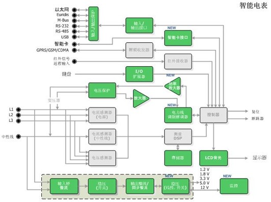 安森美半導(dǎo)體應(yīng)用于智能電表的完整解決方案安森美半導(dǎo)體應(yīng)用于智能電表的方案包含一系列標(biāo)準(zhǔn)產(chǎn)品、專用標(biāo)準(zhǔn)產(chǎn)品(ASSP)及專用集成電路(ASIC),可以提供智能電表的4種基本功能,包括:電源/電源管理、計量、寄存及通信,具體產(chǎn)品包括功率因數(shù)控制器、交流-直流(AC-DC)控制器、直流-直流(DC-DC)控制器、穩(wěn)壓器,MOSFET、整流器、三端雙向可控硅開關(guān)元件(TRIAC),PLC調(diào)制解調(diào)器、線路驅(qū)動器及信號放大器,濾波、輸入/輸出(I/O)及數(shù)據(jù)保護(hù),LCD背光驅(qū)動器,EEPROM存儲器,及智能卡接口等。圖2是由安森美半導(dǎo)體的多種器件(圖中綠色部分)構(gòu)成的智能電表應(yīng)用。