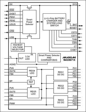 因?yàn)镸AX8671X可以無縫管理USB和交流適配器電源,使得制造商能夠省去AC/DC墻上適配器充電零配件,從而降低了系統(tǒng)成本。其集成了眾多功能:電池充電器、適配器-USB-電池開關(guān)、系統(tǒng)電壓調(diào)節(jié)以及各種檢測功能(見圖1)。5路獨(dú)立的集成穩(wěn)壓器(3路2MHz開關(guān)降壓型調(diào)節(jié)器,效率高達(dá)96%;2路低靜態(tài)電流的線性穩(wěn)壓器)可以為多個子系統(tǒng)提供高效供電。