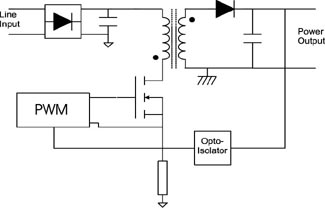 開關(guān)電源電路有許多種,但最常見的是反激式轉(zhuǎn)換器,其原理如圖1所示,電源輸入首先經(jīng)過整流,然后濾波,接下來經(jīng)過變壓器和初級開關(guān),以及初級控制器;這個控制器根據(jù)反饋信號來改變開關(guān)的占空比,反饋信號是由次級反饋而來。