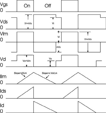 [page]當(dāng)開關(guān)閉合時,電壓施加在變壓器初級的兩端,因?yàn)榇藭r次級二極管是截止的,變壓器所起的作用就像電感器。經(jīng)過初級線圈的電流會上升,同時能量儲存在磁通量中。當(dāng)開關(guān)斷開時,次級二極管導(dǎo)通,電流通過次級時會下降,因?yàn)槟芰勘晦D(zhuǎn)換至次邊大容量電容器。如果電流經(jīng)過磁化電感區(qū)后降至零,這是不連續(xù)導(dǎo)通模式。如果磁化電流未降至零,如圖3所示,則系統(tǒng)以連續(xù)導(dǎo)通模式工作。
