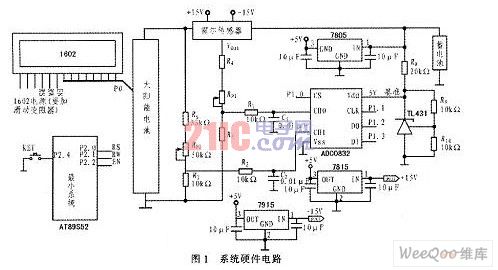 單片機(jī)正常運(yùn)行需要為片內(nèi)的晶體管或場(chǎng)效應(yīng)管供給電源,使其工作在相應(yīng)狀態(tài)。AT89S52需要一個(gè)5V電源(實(shí)際工作電壓為3.6~6.0V)??捎谜?、穩(wěn)壓方式供電,獲得4.5V左右的電壓,因本系統(tǒng)為獨(dú)立發(fā)電,且長(zhǎng)期使用,考慮到電源壽命,該裝置由市電或干電池提供驅(qū)動(dòng)電源不符合實(shí)際,所以最佳方案應(yīng)該由系統(tǒng)內(nèi)部太陽(yáng)能電池的蓄電池供電,經(jīng)穩(wěn)壓集成塊7805穩(wěn)壓為5V,輸入單片機(jī)Vcc引腳,驅(qū)動(dòng)單片機(jī)及液晶顯示裝置。TBCl0SY霍爾電流傳感器,需±15V雙電源供電,同樣采用系統(tǒng)內(nèi)的蓄電池供電.經(jīng)穩(wěn)壓集成塊7805、7915穩(wěn)壓在±15V,從而驅(qū)動(dòng)其工作。