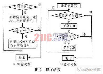 電量計(jì)算公式為Q=UIT,其中時(shí)間T可根據(jù)需要在軟件編程時(shí)自行確定,如每隔3min采樣一次,經(jīng)內(nèi)部運(yùn)算后送1602液晶顯示發(fā)電量。為了節(jié)約電能,通過(guò)設(shè)置繼電器,使液晶顯示器顯示10s后自動(dòng)熄滅。