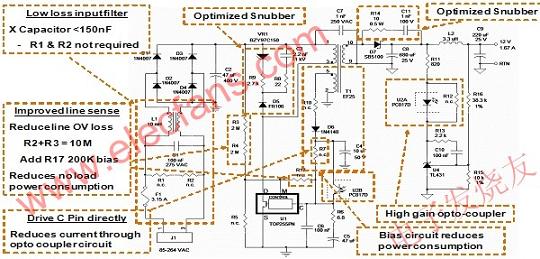 圖1:用PowerIntegrations的TOPSwitch-HX優(yōu)化過(guò)的開關(guān)電源。