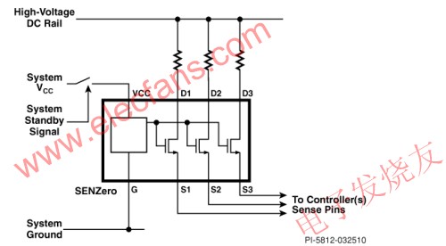 在消除市電輸入的電流消耗之后,接下來(lái)需要消除電路中的那些即使在待機(jī)狀態(tài)下也會(huì)連續(xù)消耗功率的其他元件的電流消耗。在較高功率應(yīng)用中,在高壓母線與功率因數(shù)校正(PFC)和DC/DC轉(zhuǎn)換器的電源控制器之間可能存在多條信號(hào)通路。例如包括PFC系統(tǒng)中連接升壓控制器的前饋或反饋信號(hào)通路,以及雙開關(guān)正向/LLC/半橋和全橋轉(zhuǎn)換器中的前饋信號(hào)通路。PI的第二款新產(chǎn)品是SENZero,它可以在不需要這些信號(hào)通路時(shí)將它們隔離,從而消除不必要的功率損耗。SENZero的典型應(yīng)用如圖4所示。