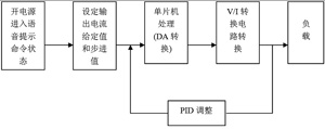 在工作過程中,SPCE061A單片機(jī)將被預(yù)置的電流值通過換算進(jìn)行D/A轉(zhuǎn)換,以輸出電壓驅(qū)動(dòng)V/I轉(zhuǎn)換電路實(shí)現(xiàn)電路輸出,并將該電流值對應(yīng)的電壓值通過閉環(huán)回路,經(jīng)A/D轉(zhuǎn)換后輸入單片機(jī)系統(tǒng),再通過PID算法調(diào)整電流輸出。整個(gè)系統(tǒng)工作流程圖如圖4所示。