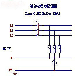 對于站內(nèi)組合電源系統(tǒng)的防雷,其防雷電路比較簡單,也比較成熟,根據(jù)‘郵標’,在組合電源系統(tǒng)交流側采用通流容量為40kA(8/20μS波形)的 “3+1”方式的交流C級防雷器,在組合電源的直流側采用通流容量為15kA(8/20μS波形)的“1+1”方式的直流防雷器即可。