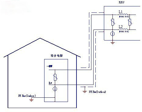 注:① 如果組合電源內(nèi)部沒有配置合適的直流防雷器,則應該在RRU電源線引出機房處加裝一級直流防雷箱;