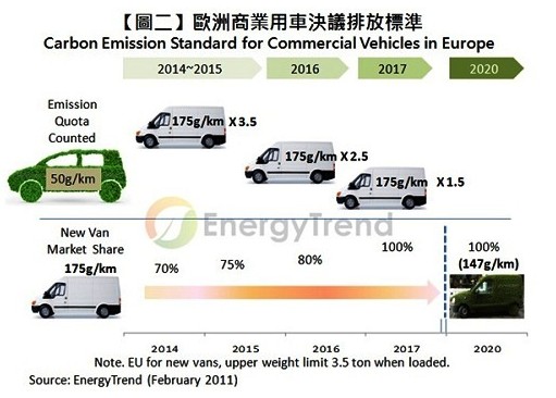 電動(dòng)車在歐洲將有重大突破,根據(jù)集邦科技(TRENDFORCE)旗下研究部門EnergyTrend的調(diào)查,歐洲國(guó)會(huì)通過了最新的商用車排放標(biāo)準(zhǔn)決議,低排放車輛將成為未來車廠必然發(fā)展的趨勢(shì),因此即使2011年鋰電池有供過于求的壓力,但是根據(jù)集邦科技的觀察,隨著車輛排放標(biāo)準(zhǔn)逐漸明確化,汽車廠為了替2014年低排放車輛上市做準(zhǔn)備,將使得鋰電池短缺情形再次上演。