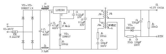 1)采用高效率恒壓/恒流式單片開關(guān)電源LNK500,交流輸入電壓范圍是85~265V,當(dāng)交流輸入電壓為265V時,漏電流<5μA,額定輸出電壓為5.5V,最大輸出電流為0.45A,輸出功率為2.5W。