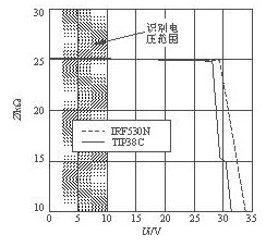 如圖4所示為使用MOSFET(V3)的開關(guān)電路。VDZ4及VDZ5分別采用28V及15V穩(wěn)壓管。當(dāng)輸入電壓超過28V時VDZ4被反向擊穿,使V3導(dǎo)通,將電源開啟。當(dāng)輸入電壓超過43V時VDZ5也被反向擊穿,能限制V3的柵-源電壓,起到保護作用。R15能防止V3被誤導(dǎo)通。該以太網(wǎng)電源模塊的識別信號阻抗與輸入電壓的關(guān)系曲線如圖5所示,識別電壓范圍是2.5~10V。