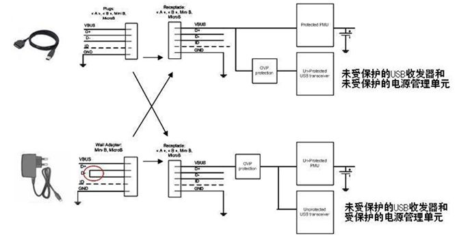 在連接個(gè)人計(jì)算機(jī)(PC)等標(biāo)準(zhǔn)USB源設(shè)備時(shí),連接器上將包含Vbus電源端子和數(shù)據(jù)端子(D+和D-)。Vbus電壓值由USB規(guī)范明 確定義:額定電壓為5V,最高可達(dá)5.25V。事實(shí)上,較長(zhǎng)的線纜會(huì)因串連電感產(chǎn)生振鈴現(xiàn)象。這個(gè)最大振鈴紋波電壓取決于移動(dòng)設(shè)備的輸入電容和寄生電感。 售后非原配件往往具有較低的性能,電纜也會(huì)有較高的寄生參數(shù),這些因素對(duì)連接的外設(shè)可能造成潛在危害。