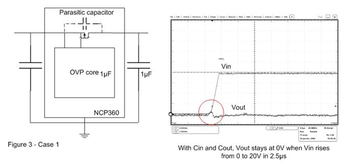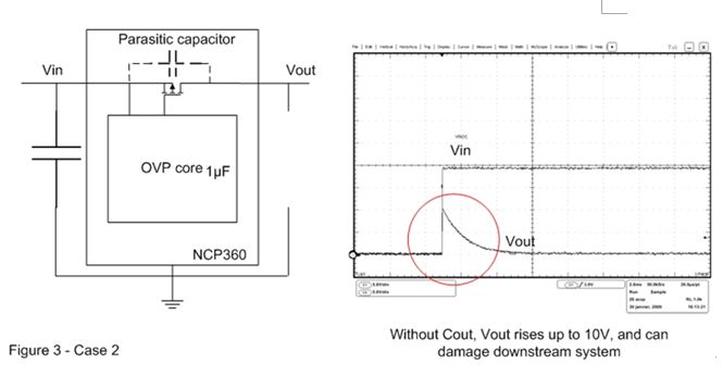 在圖3的案例2中,輸出電容已被移除。這樣,當(dāng)OVP器件輸入端出現(xiàn)快速輸入瞬態(tài)現(xiàn)象時(shí),旁路元件將保持開(kāi)路。這時(shí)可以在輸出端觀察到過(guò) 沖,這個(gè)過(guò)沖可能會(huì)損壞連接至OVP輸出端的電子元器件。為了解決這個(gè)問(wèn)題,必須在輸出引腳上連接一個(gè)輸出電容,并盡量靠近OVP器件擺放。