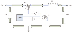 當Q1關(guān)斷、Q2導(dǎo)通時,就形成了第二個回路。之后存儲在L1內(nèi)的能量流經(jīng)輸出電容器和Q2,如圖5所示。這些回路面積控制對于降低電磁干擾是很重要的,在PCB走線布線時就要預(yù)先考慮清器件的布局問題。當然,回路面積能做到多小也是有實際限制的。