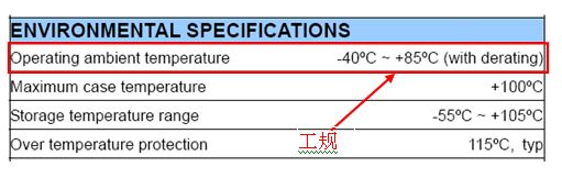 一般溫度操作可分成商規(guī)(0℃~+60℃)、工規(guī)(-25℃~+71℃)、軍規(guī)(-55℃~+85℃)等,在選擇DC/DC 電源模塊時(shí)需考慮實(shí)際系統(tǒng)操作溫度范圍,選用合適的溫度等級。