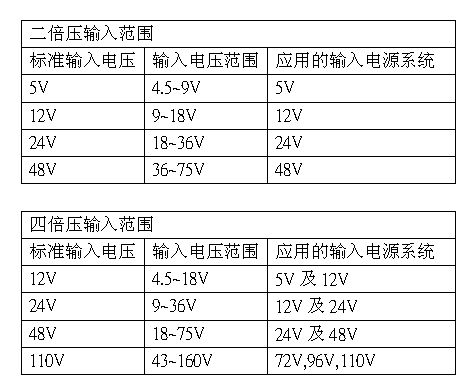 在選用電源模塊輸入電壓范圍時(shí),視輸入電壓變動范圍,業(yè)界有二倍壓輸入及四倍壓輸入可選擇,電壓范圍如下: