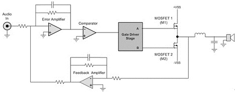 PWM信號(hào)進(jìn)行適當(dāng)?shù)碾娖阶儞Q,然后送到柵極驅(qū)動(dòng)器,這個(gè)驅(qū)動(dòng)器控制由MOSFET(M1和M2)組成的雙態(tài)功率電路。放大后的信號(hào)然后通過(guò)輸出濾波器(消除PWM載波頻率),最終僅僅放大了的模擬音頻信號(hào)驅(qū)動(dòng)揚(yáng)聲器。通過(guò)把濾波器輸入信號(hào)反饋到錯(cuò)誤放大器輸入端,進(jìn)行外部環(huán)路濾波,降低了失真和噪聲,進(jìn)一步提高了音頻輸出保真度。