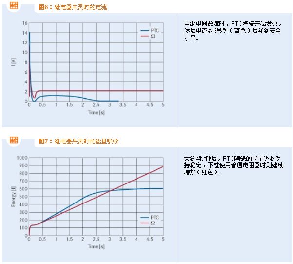 當(dāng)發(fā)生故障時(shí),PTC熱敏電阻用作限流元件的優(yōu)勢(shì)就會(huì)十分明顯。如果繼電器接通失敗,負(fù)荷電流將流經(jīng)充電電阻器,并產(chǎn)生強(qiáng)大的熱應(yīng)力,這要求電阻器有相應(yīng)的尺寸。若采用基于PTC陶瓷的充電電阻器,其電阻會(huì)由于強(qiáng)大的起始功率損耗而升至數(shù)10 k,從而能夠在故障發(fā)生期間限定電流(參見(jiàn)圖6)。在約三秒之后,先流經(jīng)兩電阻器然后流經(jīng)總體電路的電流已跌至數(shù)10 mA。有關(guān)吸取能量的比較,請(qǐng)參見(jiàn)圖7。