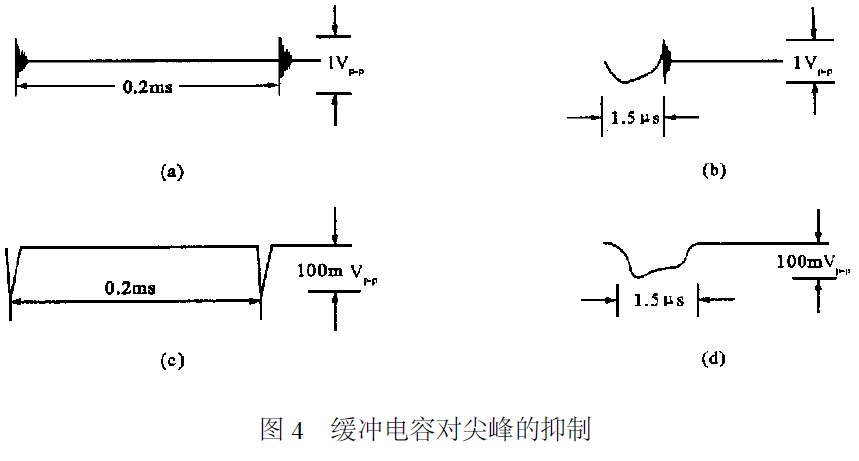 在開(kāi)關(guān)三極管的CE之間,或者在續(xù)流二極管的兩端并聯(lián)RC緩沖電路可使尖峰干擾明顯減小。圖3中,三極管T關(guān)斷時(shí),集電極電壓上升,通過(guò)D和R1對(duì)C充電,使其上升速率變緩,選擇充電常數(shù)CR1的值可以控制上升速率。T導(dǎo)通時(shí),D截止,C對(duì)R1和R2放電,限制了導(dǎo)通瞬間的峰值電流。該緩沖電路改變了負(fù)載線(xiàn)的形狀,減少了開(kāi)關(guān)三極管的損耗。在續(xù)流二極管兩端并上RC電路也同樣有效。圖3中,當(dāng)用3DD11和2CK120C時(shí),可并0.022LF左右的電容器(f=2kHz),該電容的容量有一最佳值,它的作用可以從圖4看出。圖4(a)是不加C的情況,將其在時(shí)間軸上放大后為圖4(b)。并上緩沖電容后分別見(jiàn)圖4(c)和(d)。