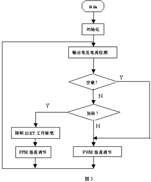 在此硬件電路的基礎(chǔ)上,結(jié)合單片機(jī)的控制系統(tǒng)可檢測輸出電壓低于某一設(shè)定值時,單片機(jī)便認(rèn)為負(fù)載電弧是處于短路狀態(tài),這時單片機(jī)便對IGBT的最小脈沖寬度進(jìn)行限制,以保證吸收電容有足夠的放電時間,從而降低IGBT的關(guān)斷反向電壓。同時為保證輸出電流恒定,單片機(jī)在判斷輸出為短路時將逆變器的等脈沖寬度調(diào)節(jié)(PWM)變?yōu)轭l率調(diào)節(jié)控制(PFM),即脈沖分頻控制,輸出電壓越低,輸出脈沖的頻率越低。其單片機(jī)程序過程如圖5所示: