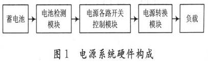 本電源系統(tǒng)各部分主要實現(xiàn)的功能如下:供電電源由2塊12 V的鉛酸蓄電池串聯(lián)而成,為系統(tǒng)提供24 V的直流電壓;電池檢測模塊主要是通過對供電電源的輸出電壓進行取樣,以獲取蓄電池的電量消耗信息,實時對電池充電以保證整個系統(tǒng)正常穩(wěn)定的工作;電源各路開關(guān)控制模塊主要是根據(jù)系統(tǒng)負載的工作狀態(tài),通過開關(guān)控制決定是否為該負載供電,以此來降低待機功耗,延長電池的使用時間;電源變換模塊主要用模塊DC-DC轉(zhuǎn)換器作為構(gòu)建單元實現(xiàn)電源電壓的轉(zhuǎn)換為負載提供合適的電壓。