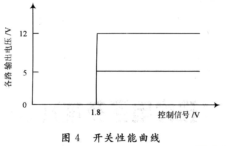 場效應(yīng)管選擇了增強型P溝道場效應(yīng)管IRF9640和增強型N溝道場效應(yīng)管VN2222L。以場效應(yīng)管IRF9640作為開關(guān)管來控制電路的通和斷,以場效應(yīng)管VN2222L作為開關(guān)控制管來控制場效應(yīng)管IRF9640的開和關(guān)。當控制信號輸入端輸入高電平時,開關(guān)電路導(dǎo)通;當控制信號輸入端輸入低電平時,開關(guān)電路斷開。經(jīng)過試驗測得:當控制信號電壓從0 V逐漸上升到1.8 V時開關(guān)導(dǎo)通;當電壓從高電平(如3.3 V)逐漸下降到1.8 V時開關(guān)斷開。此開關(guān)電路的性能如圖4所示。