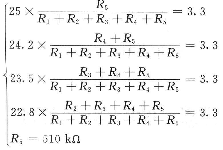 電池電壓取樣電阻網(wǎng)絡(luò)是通過取樣電阻的組合對電池的輸出電壓進行分壓取樣,各電阻端點對應(yīng)的電池電壓狀態(tài)值分別為:R2對應(yīng)22.8 V,R3對應(yīng)23.5 V,R4對應(yīng)24.2 V,R5對應(yīng)25 V。當電池輸出的電壓值等于各個電阻設(shè)定的狀態(tài)值時,則該電阻端取樣電壓為3.3 V;當電池輸出的電壓值大于各個電阻設(shè)定的狀態(tài)值時,則該電阻端取樣電壓大于3.3 V;當電池輸出的電壓值小于各個電阻設(shè)定的狀態(tài)值時,則該電阻端取樣電壓小于3.3 V。取樣電阻R1,R2,R3,R4,R5的取值可由下面的方程組求得: