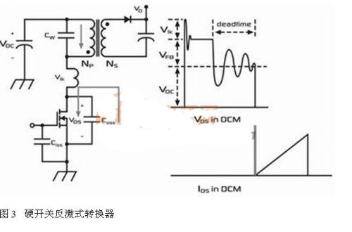 圖3示出傳統(tǒng)硬開關(guān)反激式轉(zhuǎn)換器。在這種傳統(tǒng)的間斷模式反激式轉(zhuǎn)換器 (DCM) 的停滯時(shí)間期間,寄生電容將與VDC周圍的主要電感發(fā)生振蕩。寄生電容上的電壓會(huì)隨振蕩而變化,但始終具有相當(dāng)大的數(shù)值。當(dāng)下一個(gè)時(shí)鐘周期的MOSFET 導(dǎo)通時(shí)間開始時(shí),寄生電容 (COSS和CW) 會(huì)通過(guò)MOSFET放電,產(chǎn)生很大的電流尖峰。由于這個(gè)電流出現(xiàn)時(shí)MOSFET存在一個(gè)很大的電壓,該電流尖峰因此會(huì)做成開關(guān)損耗。此外,電流尖峰含有大量的諧波含量,從而產(chǎn)生EMI。[page]