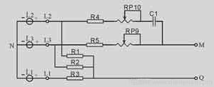 在保護(hù)器電源輸入端⑤、⑥、⑦串接相應(yīng)的RC移相電路(R4、RP9、C11、RP10、R5、R3)。調(diào)整相應(yīng)電位器RP9、RP10,使加至整流橋輸入端M、Q的電壓為確定值(在保護(hù)器工作電源處于額定電壓下進(jìn)行調(diào)整)。如工作電壓有波動(dòng),則由相應(yīng)RC移相電路使整流橋電壓輸入端電壓發(fā)生變化,從而使IC3A②端電壓Vcc也發(fā)生變化。在取樣電路中加入V1穩(wěn)壓管,則保證電壓檢測值不得超過V1穩(wěn)壓值。如超出,則IC3A中V③<V②,輸出①端為“0”,并使IC3B⑤端電平為“0”(C6經(jīng)R28放電,電平下降);同時(shí),IC3B輸入端V⑤<V⑥(V⑥電平由R24、R23分壓取得),輸出端⑦亦為“0”,使IC2⑥端電平為“0”,產(chǎn)品處于保護(hù)狀態(tài)。