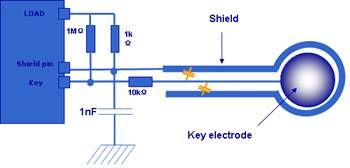 在STM8S的解決方案中,ST提供了感應(yīng)電極和走線的設(shè)計(jì)規(guī)范和如圖3所示的Driven Shield功能(在Shield線上提供與按鍵管腳相同的驅(qū)動(dòng)信號(hào),電極與Shield之間的寄生電容就不會(huì)被充放電),能有效地減少感應(yīng)電極走線的寄生電容對按鍵靈敏度的影響。