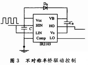 不對(duì)稱半橋驅(qū)動(dòng)電路,如圖3所示。驅(qū)動(dòng)集成芯片采用IR公司的IR2103,其輸出級(jí)作為推挽驅(qū)動(dòng)輸出,以直接耦合的方式與主電路的開(kāi)關(guān)管相連接,由HO和LO的輸出分別作為驅(qū)動(dòng)橋式電路的上、下橋臂。為了實(shí)現(xiàn)上橋臂驅(qū)動(dòng)電路的地電位與主電路的同步浮動(dòng),采用由DB和CB組成的外接自舉電路。