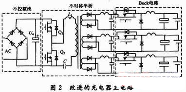改進(jìn)的新型充電器主電路,如圖2所示。前級(jí)采用軟開(kāi)關(guān)不對(duì)稱半橋?qū)崿F(xiàn)了多路的隔離輸出,并且利用自身產(chǎn)生的寄生參數(shù),實(shí)現(xiàn)諧振式零電壓軟開(kāi)關(guān)以此減小開(kāi)關(guān)的損耗,同時(shí)也避免了因變壓器漏感而帶來(lái)的電壓尖峰。后級(jí)采用成熟簡(jiǎn)單的Buck電路拓?fù)洌瑢?shí)現(xiàn)降壓并用此來(lái)滿足三段式充電的要求。