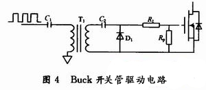 當(dāng)驅(qū)動(dòng)門極的輸出為高電平時(shí),隔離變壓器驅(qū)動(dòng)側(cè)電容能夠防止直流分量流過(guò)變壓器的初級(jí),而另一側(cè)電容和二極管能夠把電壓變?yōu)閱螛O性。同時(shí)兩個(gè)電容的取值至少是MOSFET器件本身的門極電容的10倍。