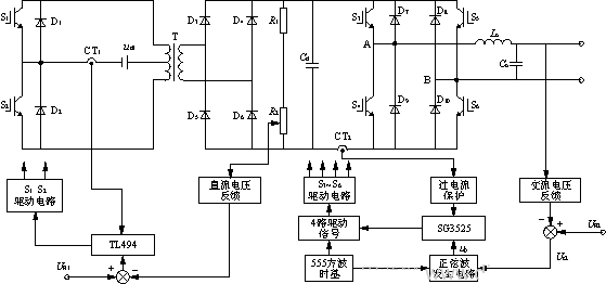 再經過全橋DC/AC逆變電路,得到220V/50Hz交流電壓輸出。為保證系統(tǒng)可靠運行,防止主電路對控制電路的干擾,采用主、控電路完全隔離的方法,即驅動信號用光耦隔離,反饋信號用變壓器隔離,輔助電源用變壓器隔離等。